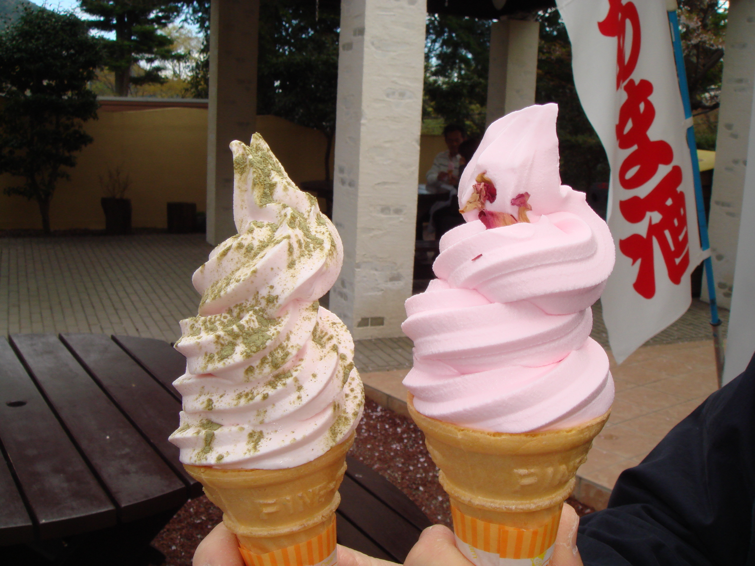 右、バラのソフト。300円。バラの花びらが2枚ほど入っており、味もバラのエッセンスが利いています。