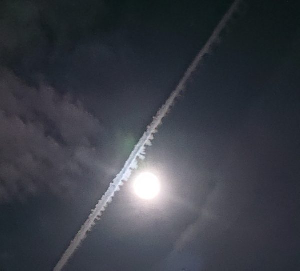 飛行機雲なんでしょうけれど、最初に見た時もっと線がくっきりしていました。でも写りのいい場所に移動している間に、風で雲が流れて広がってしまいました。